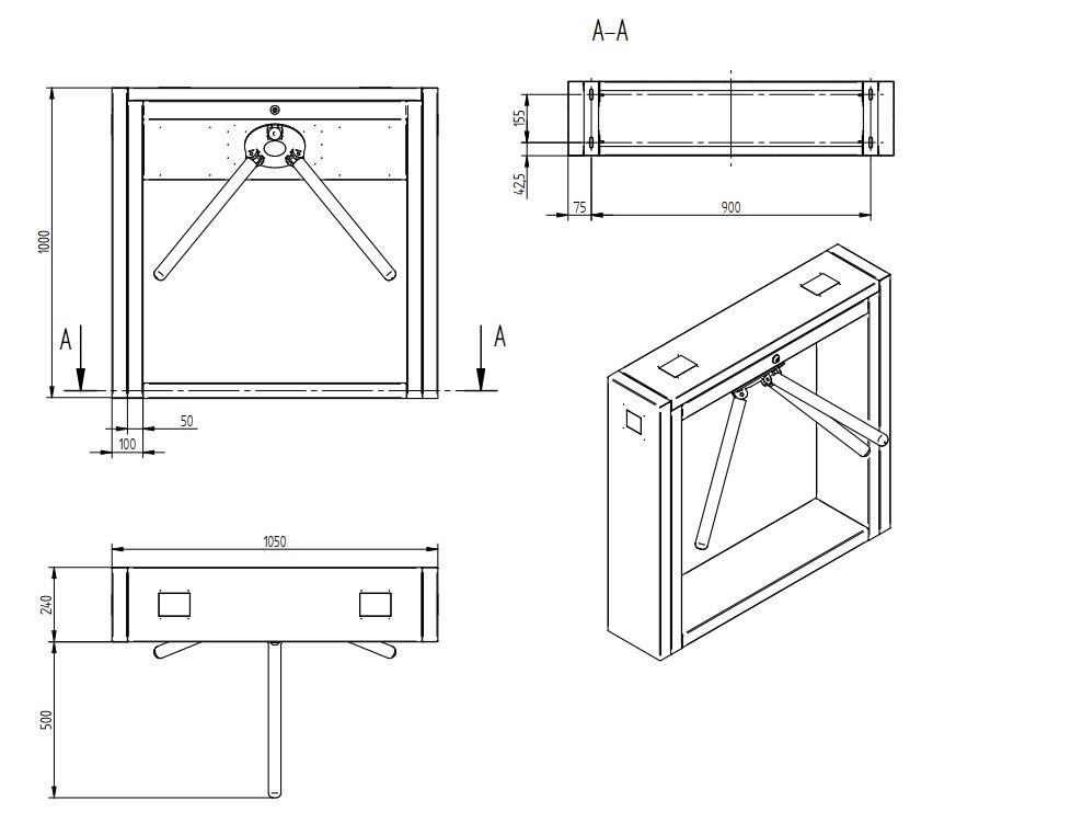 - Skříň turniketu je vyrobena z broušeného nerezového plechu o tl. 1,5 mm, otočná ramena z nerezových trubek, průměr 40 mm, délka 500 mm