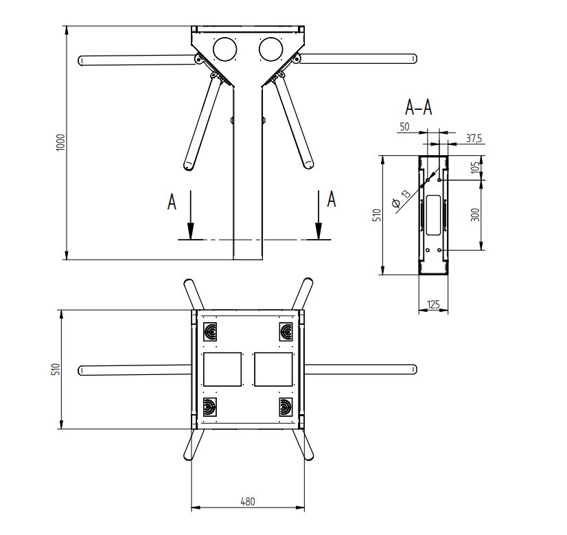 - Skříň turniketu je vyrobena z broušeného nerezového plechu o tl. 1,5 mm, otočná ramena z nerezových trubek, průměr 40 mm, délka 500 mm