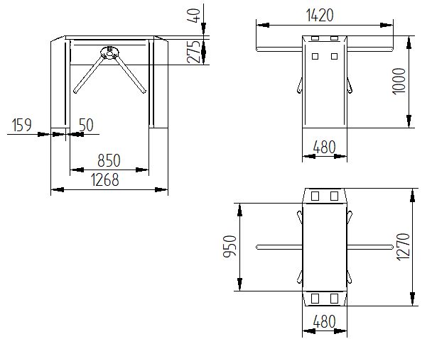 - Skříň turniketu je vyrobena z broušeného nerezového plechu o tl. 1,5 mm, otočná ramena z nerezových trubek, průměr 40 mm, délka 500 mm