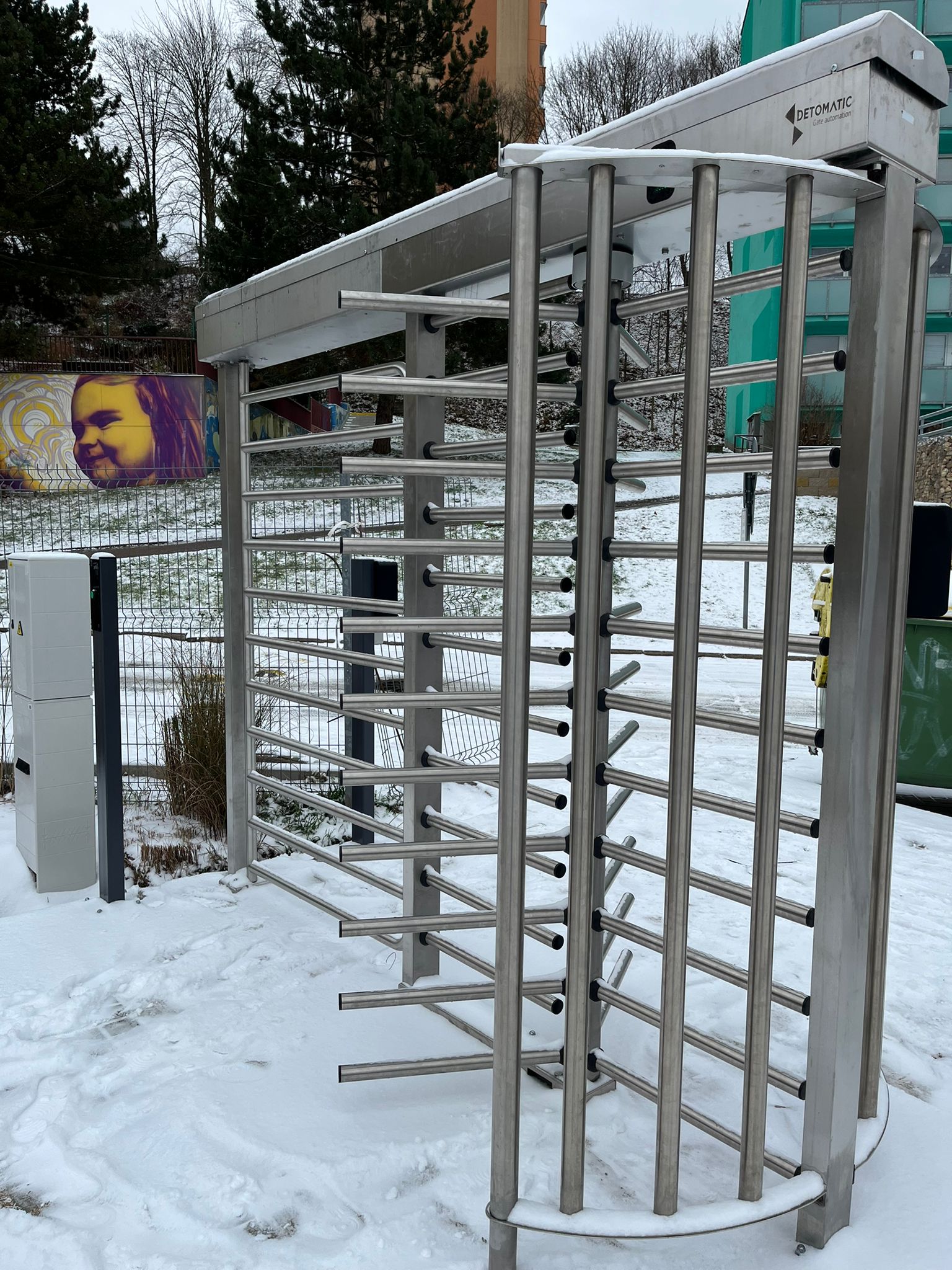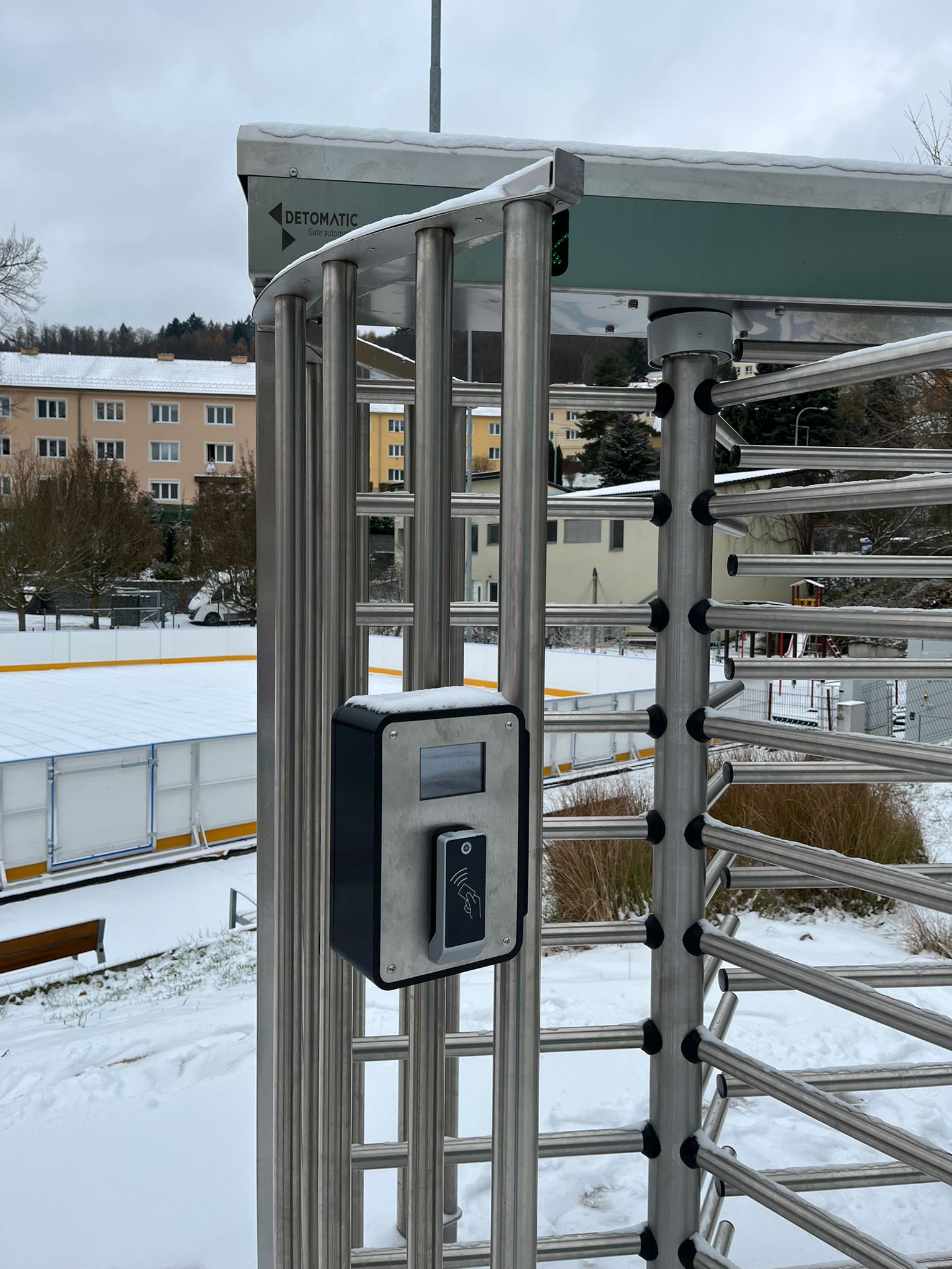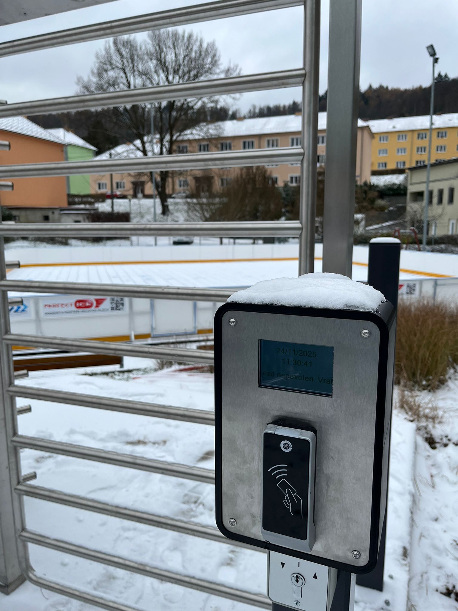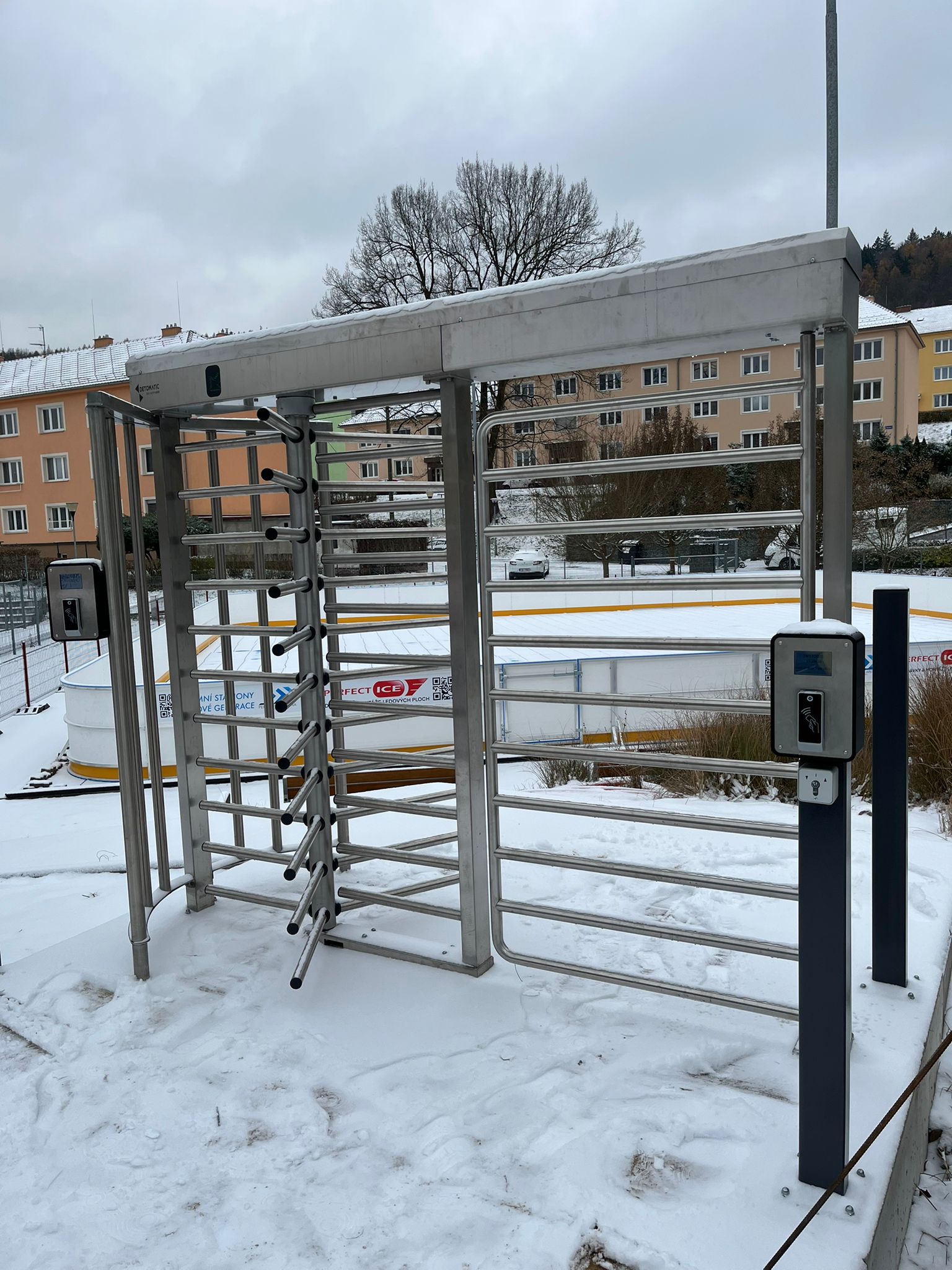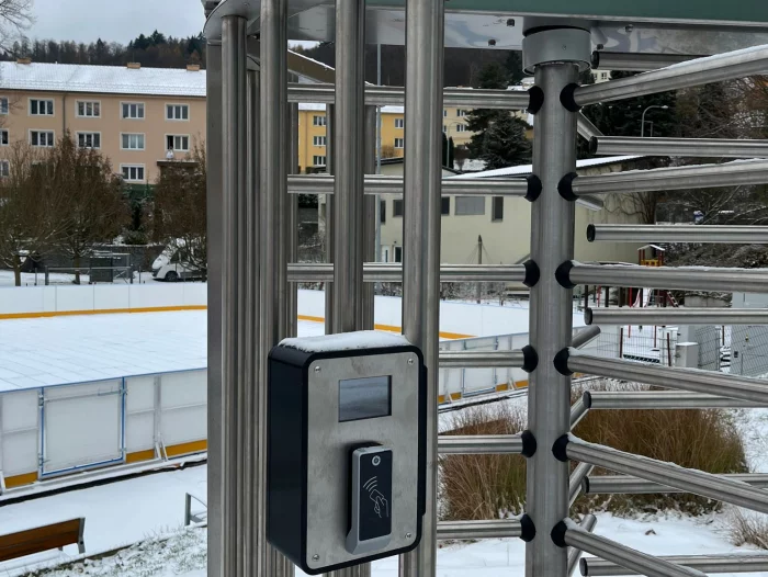 Plnorozměrný turniket s bránou ke vstupu na mobilní kluziště v Adamově na Blanensku