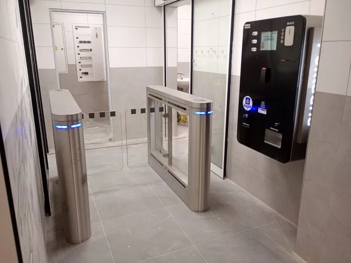 Turnikety s pokladnou ke vstupu na toalety na nádraží v Chocni